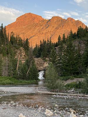 Sunrise lighting up the peak behind Running Eagle Falls in Glacier National Park